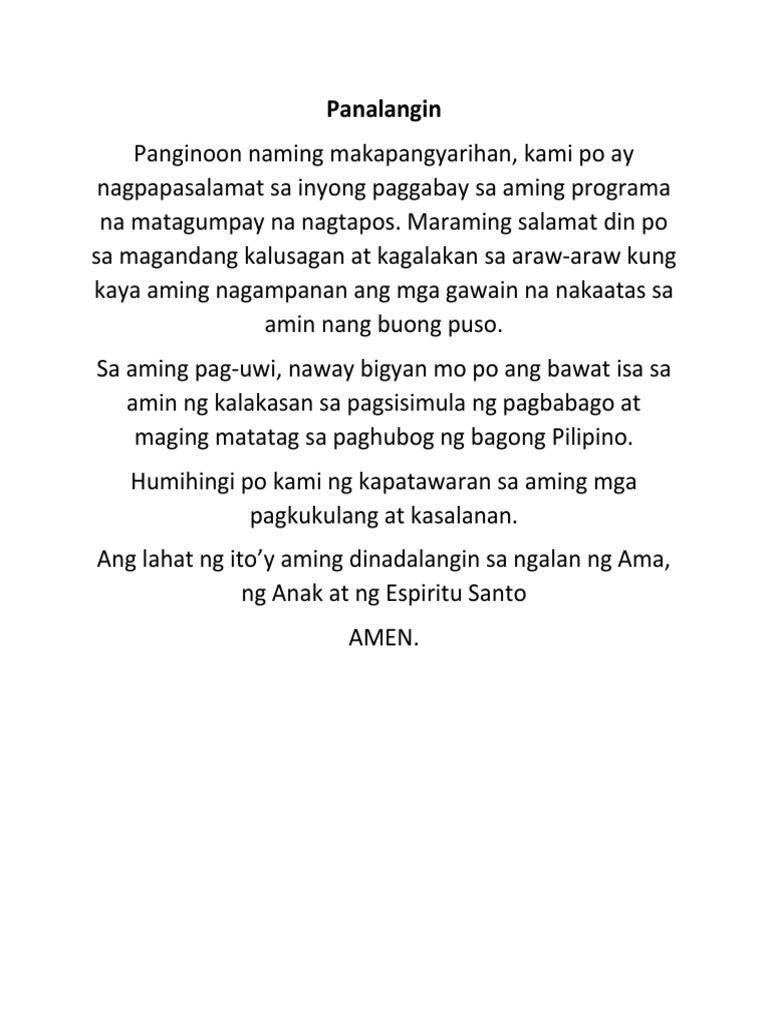 Idinadalangin namin ang lahat ng mga kalalakihan mga binata mga Ama at magiging Ama. Mar 11 2014 Idinadalangin namin ang lahat ng ito upang itanghal ang mithiin sa minumutyang Pilipinas isang bayang banal isang dambana ng bayan na ang mga namumuno ay namamathala dahil namamahala ayon sa inyong kalooban at ang mga mamamayan ay isinasabuhay ang Inyong kagustuhan. Sapagkat kamiy natutuwa kung kamiy mahihina at kayoy malalakas.