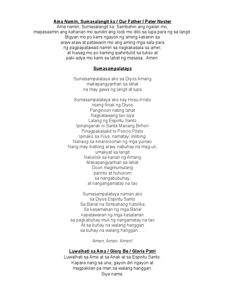 Sumasampalataya Sumasampalataya ako sa Diyos Amang Makapangyarihan sa lahat na Maylikha ng langit at lupa. Lahat ay babangitin nang pabulong This is the widely used Tagalog translation of the prayer known as Hail Mary Ave Maria in Latin. Jan 01 2012 1 Sa Ngalan Ng Ama The Sign of the Cross Signum Crucis Version A and B 2 Sumasampalataya The Apostles Creed Credo Version A and B 3 Ama Namin Our Father The Lords Prayer Pater Noster Version A 31 Ama Namin Our Father Pater Noster Version B.