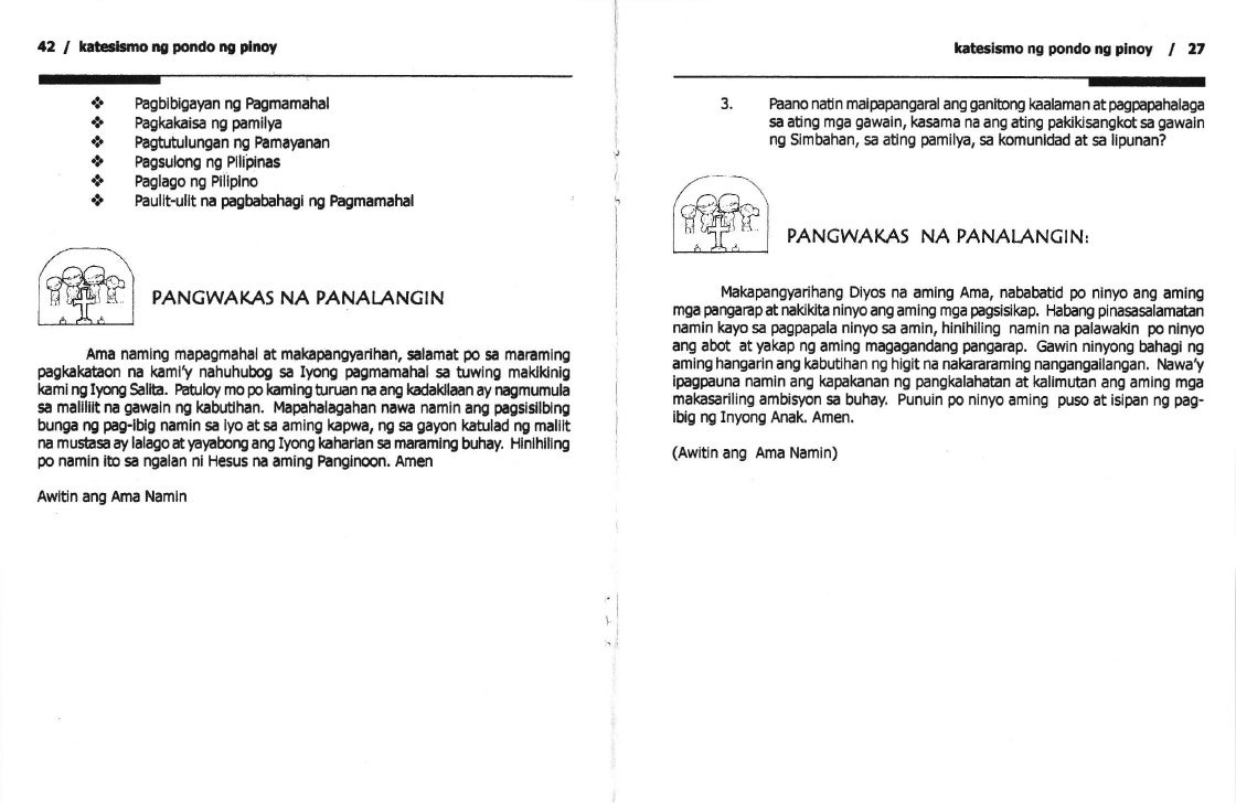DAGLAT ABBREVIATIONS NCDP - National Catechetical Directory for the Philippines KIK - Katesismo ng Iglesia Katolika KPK - Katesismo para sa mga Pilipinong Katoliko PCP II - Second Plenary Council of the. Sa panalangin na tinatawag ng marami na Ama Namin naroroon ang mga salitang. Sa katesismo nito itinuturing ng Simbahang Romano Katoliko ang Ama Namin na siyang saligan ng panalanging Kristiyano Kinikilala ng The World Book Encyclopedia ang mahalagang dako ng panalanging ito sa lahat ng mga relihiyon sa Sangkakristiyanuhan anupat inilalarawan itong isa sa mga saligang kapahayagan ng Kristiyanong.